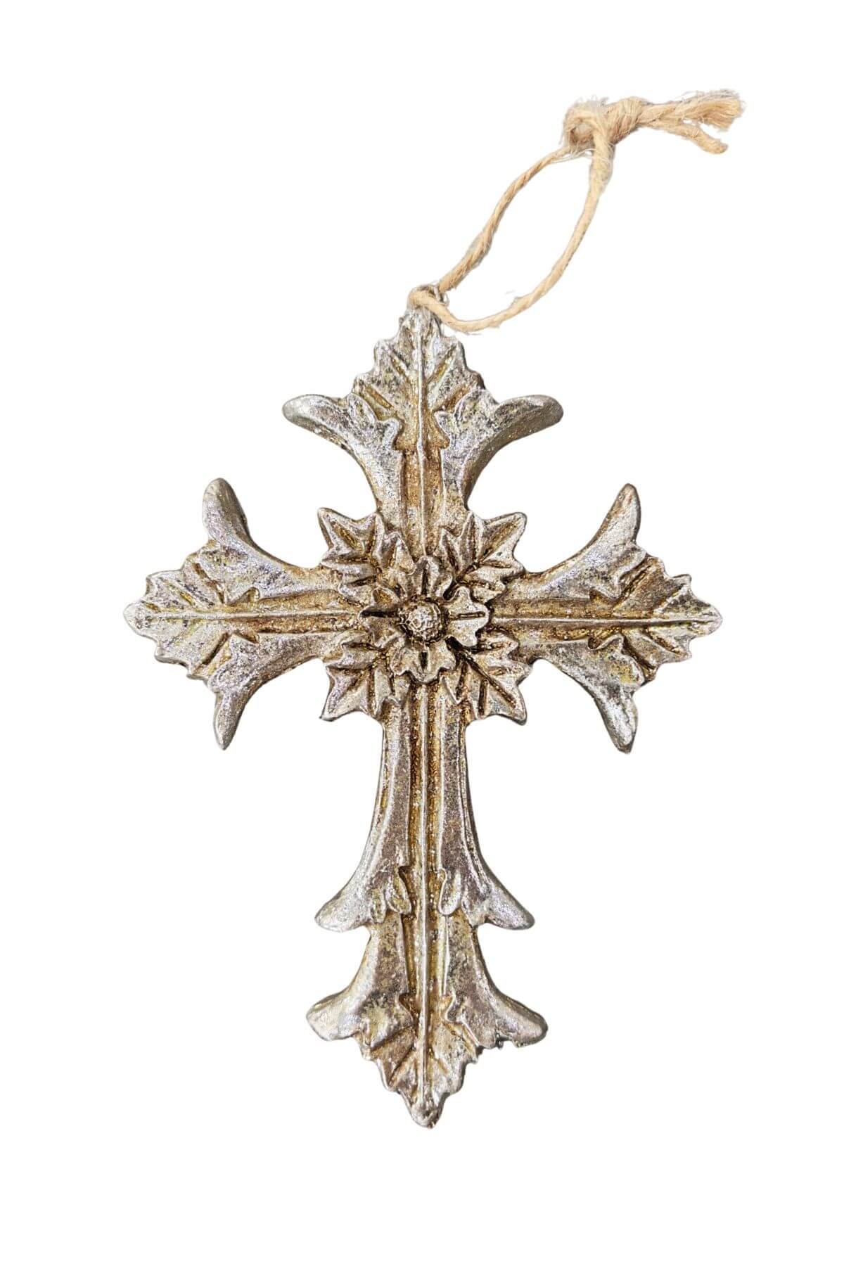 Kopott ezüst színű, felfüggeszthető kereszt, finom patinával. A kereszten van egy madzag, amire felfüggeszthető.