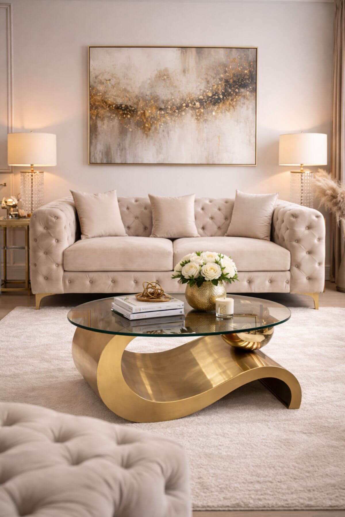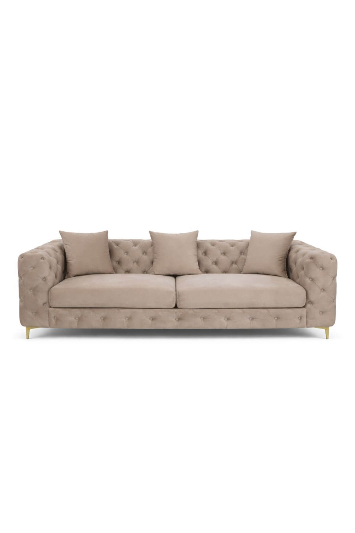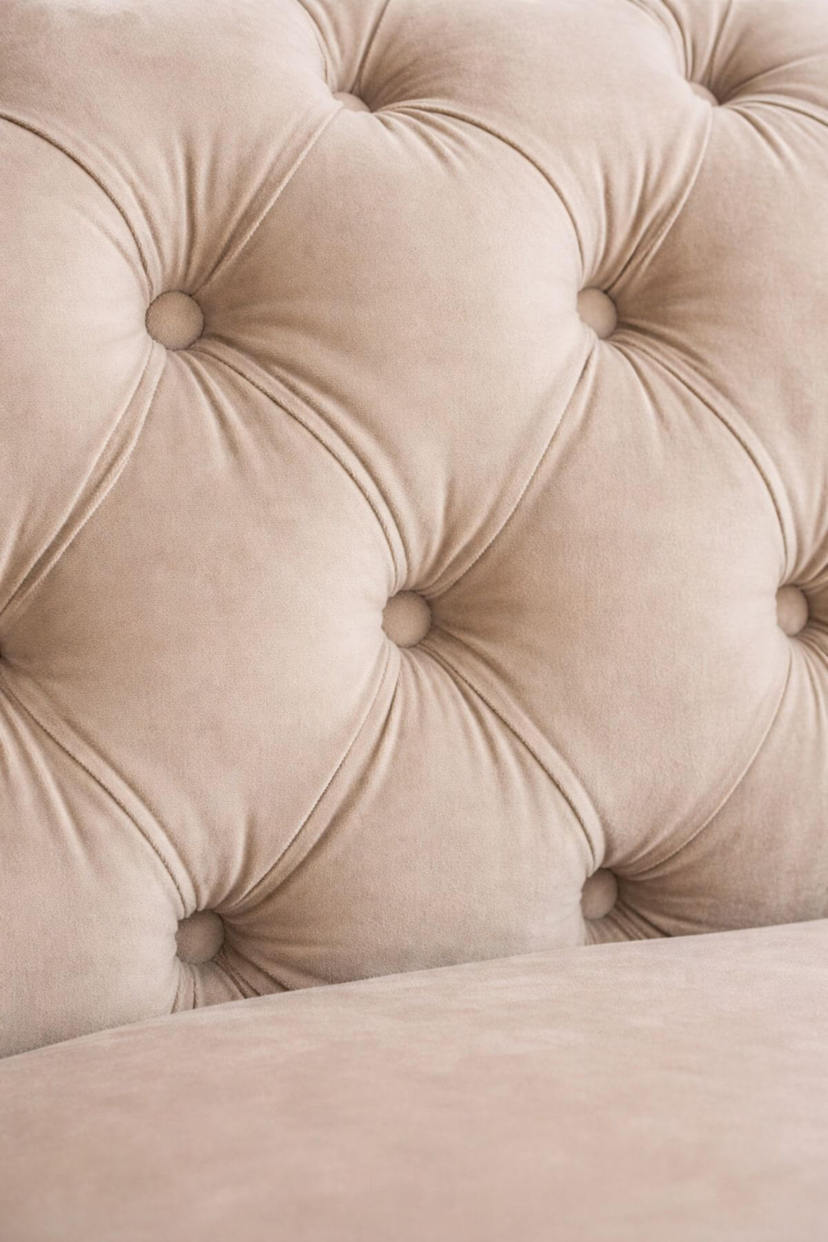 Kellemes tapintású, 3 személyes, bézs bársony ülőke, Chesterfield dizájnú luxus varással. A kialakításának köszönhetően rendkívül kényelmes. Nem csak modern belterekbe passzol!