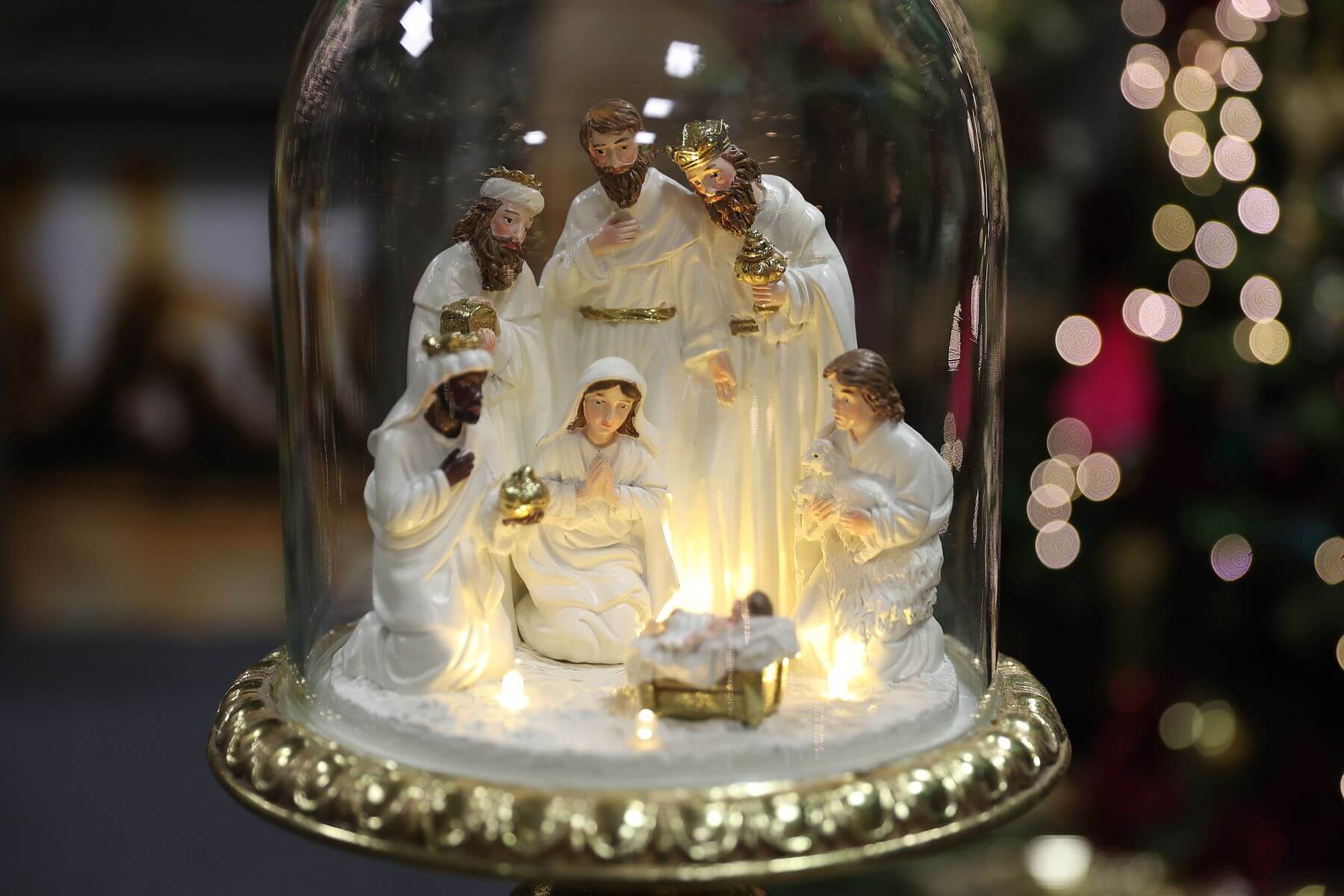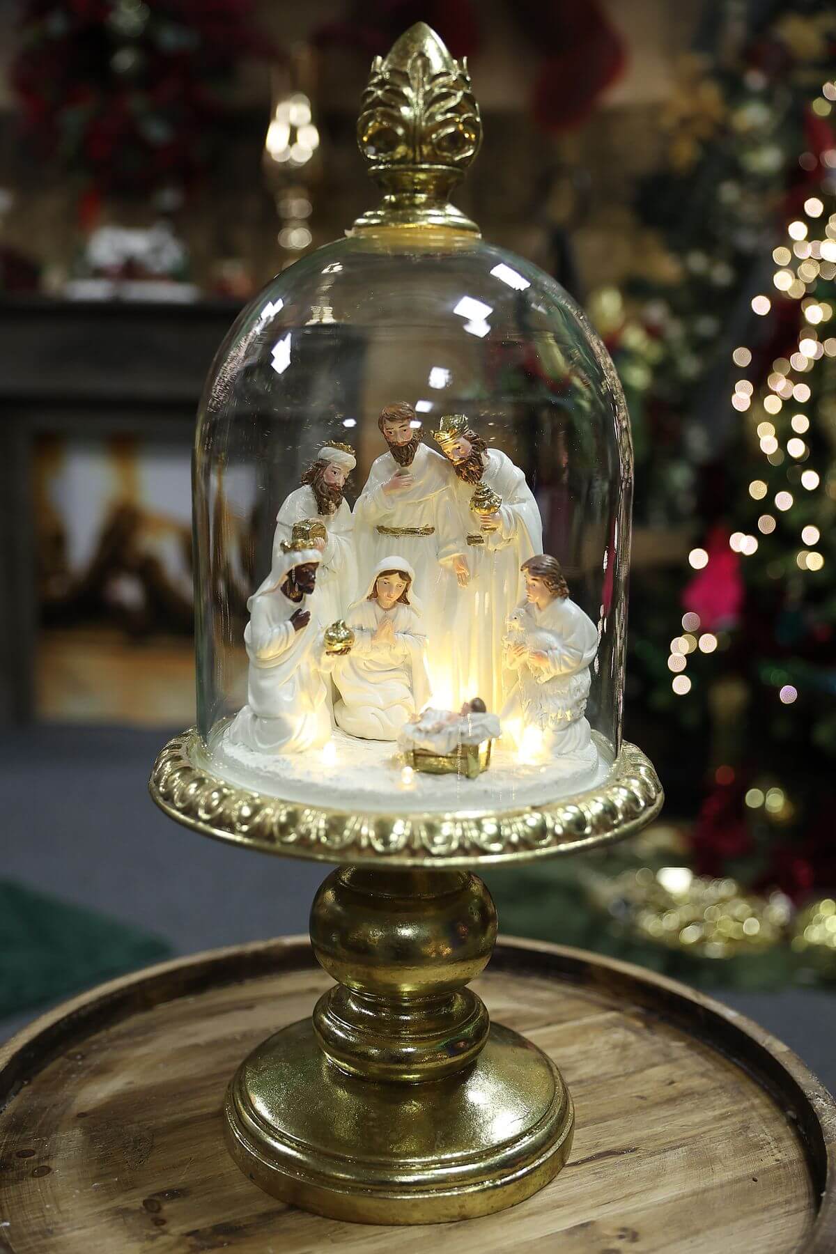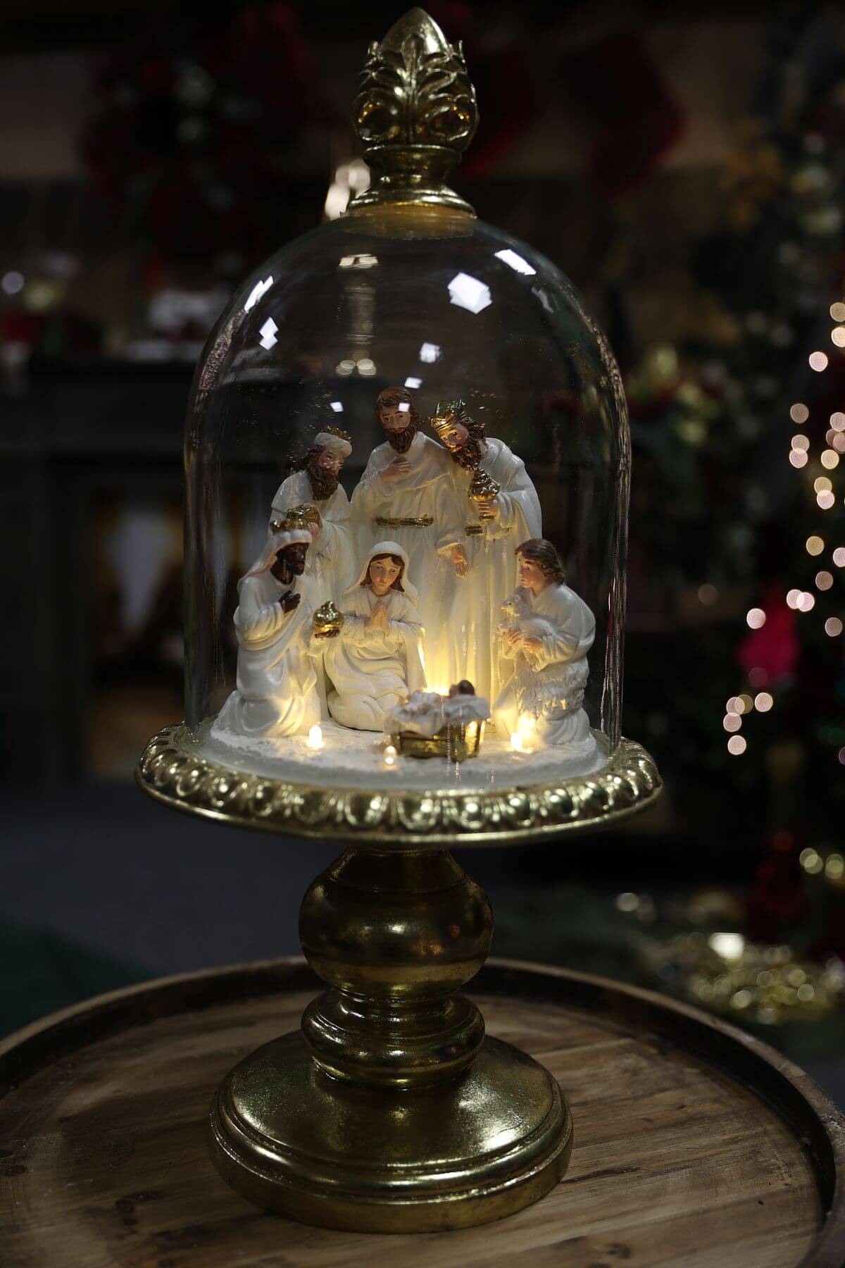 Gyönyörű, részletesen kidolgozott Betlehem, egy üveg kupolában - a karácsonyi dekoráció elengedhetetlen része. A Betlehem LED égőkkel megvilágított. A szükséges 3db AA elem nem képezi a csomag részét.