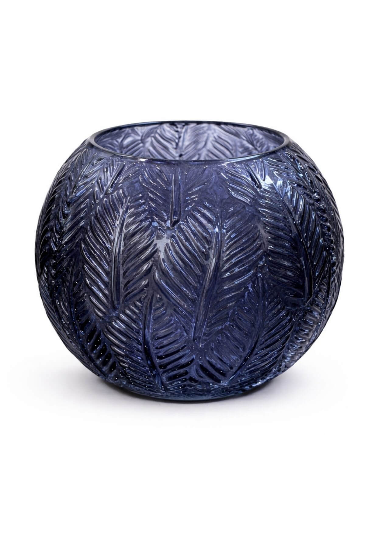 Kék üvegváza, levél mintával - ideális elő és művirágokhoz egyaránt. Nemcsak praktikus, de elegáns belső kiegészítőként is szolgál. Különösen alkalmas a modern belterekbe.