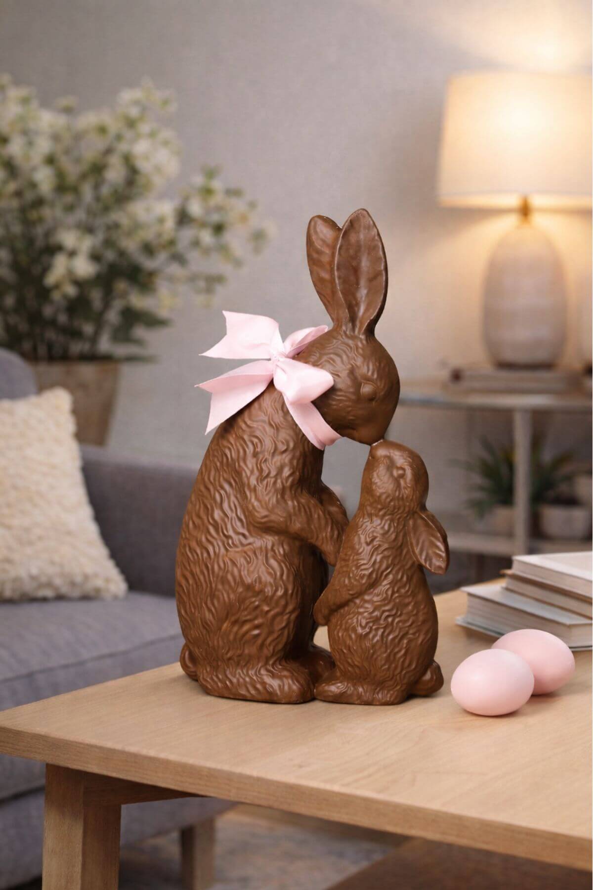 Anyai szeretetet ábrázoló, kerámia csoki dekoráció. Ezek az édes nyuszik ideálisak egyedülálló húsvéti díszként, de a tavaszi dekorációkban is kitűnnek.