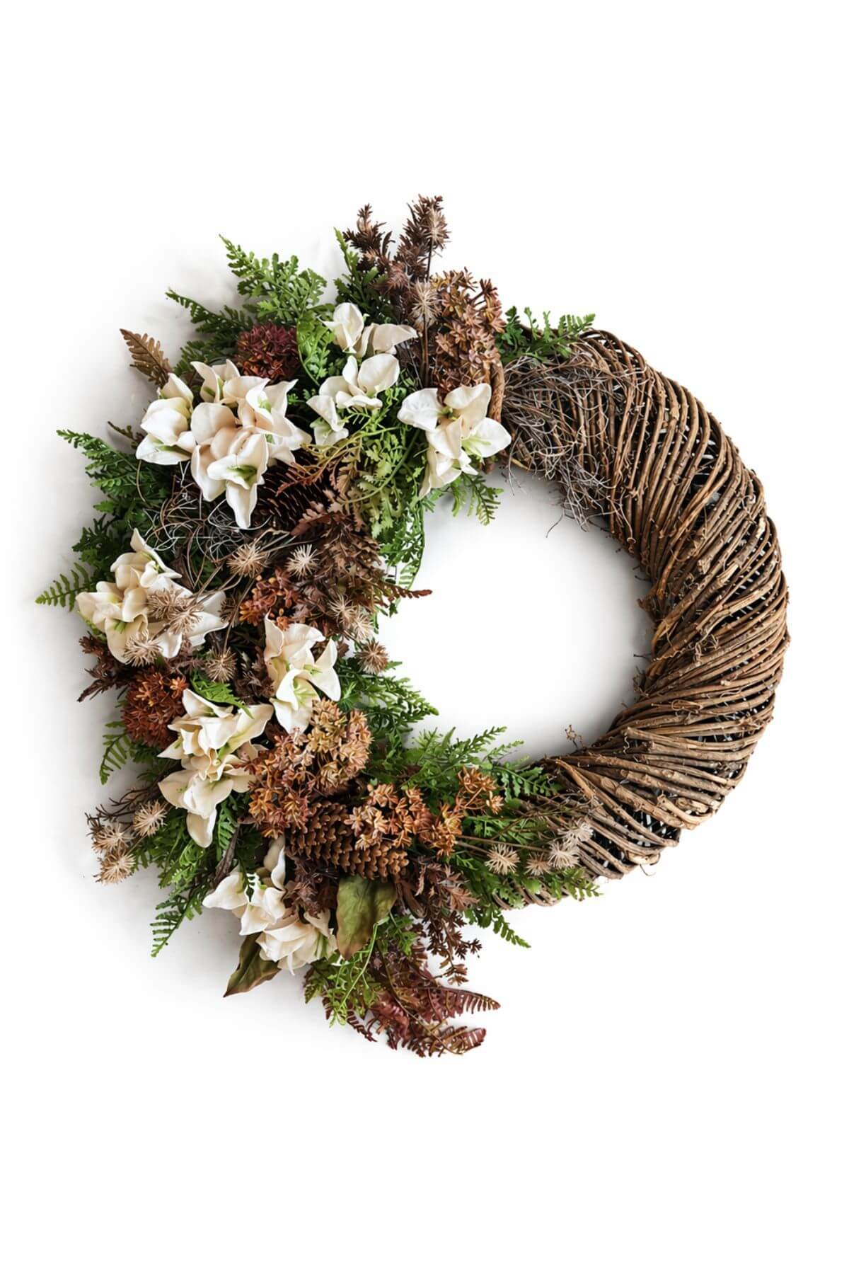 Rusztikus koszorú természetes anyagokból, finom virágokkal és zöld növényekkel, amely meleg és elegáns hangulatot kölcsönöz a térnek.