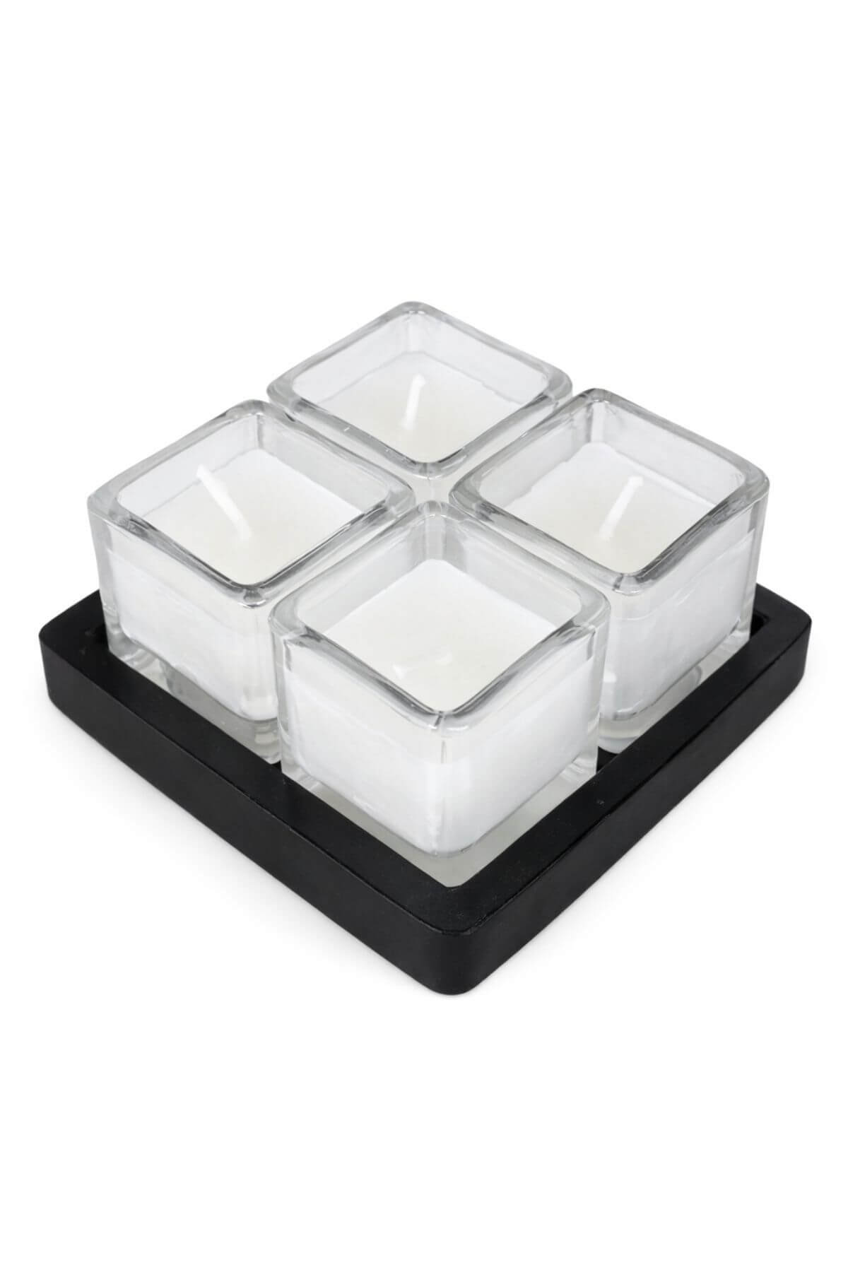 Négyzet alakú fehér gyertyák fa tálcán 11cm