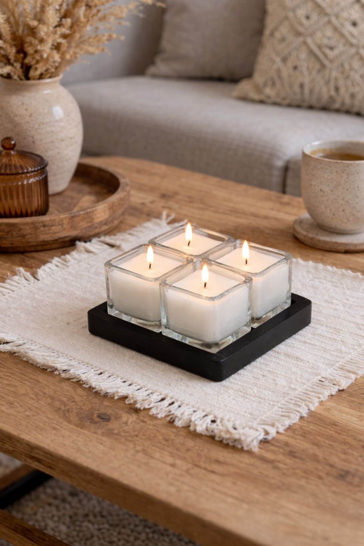 Ezek, a fa tálcán lévő, kocka alakú gyertyák, ideálisak egészéves asztali dekorációként.