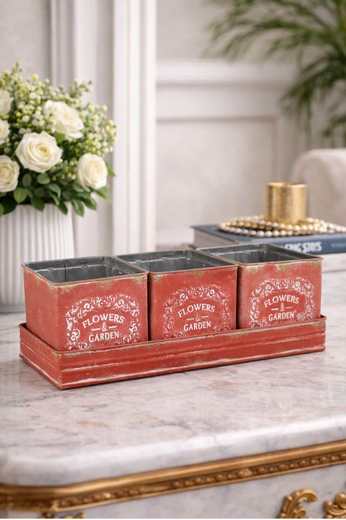 Négyzet alakú piros vintage bádog kaspó 3-szett