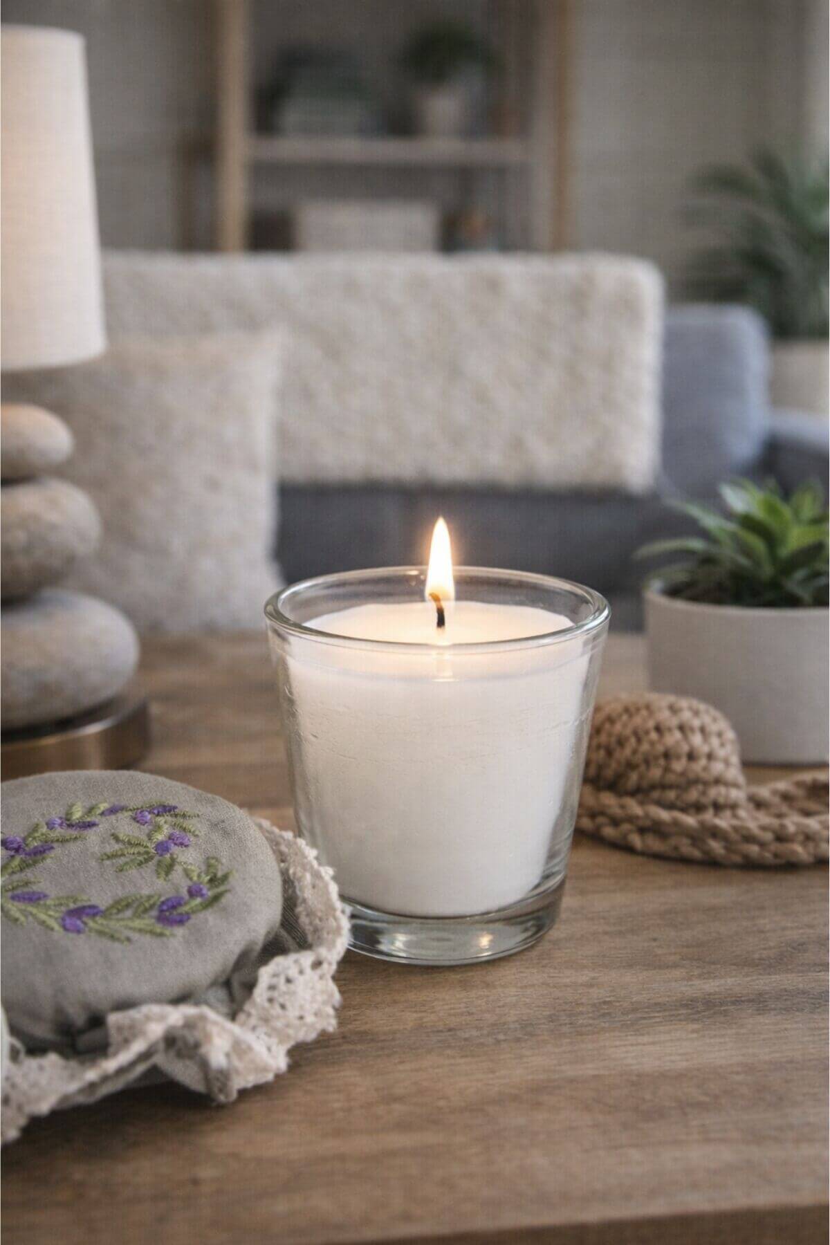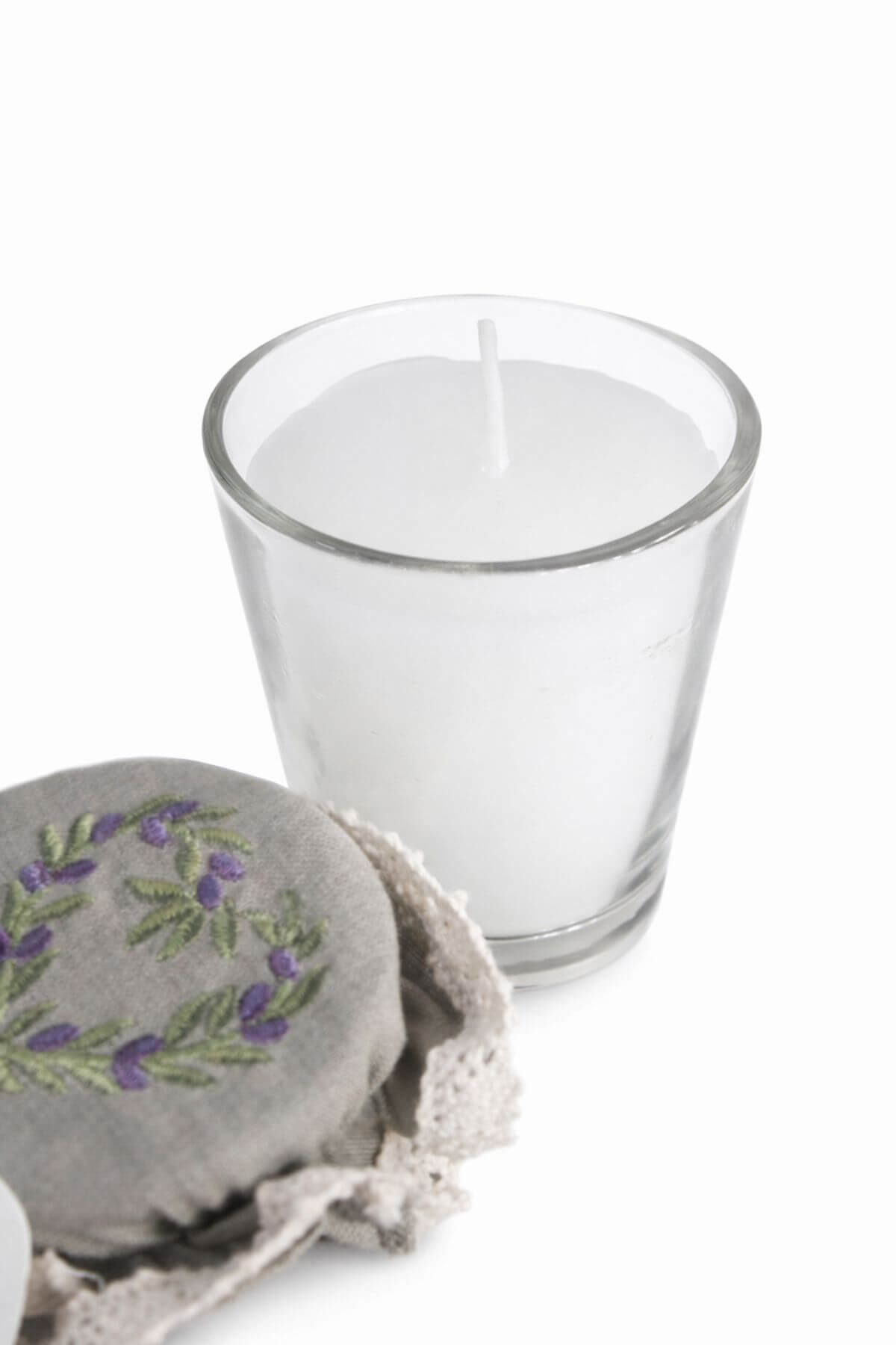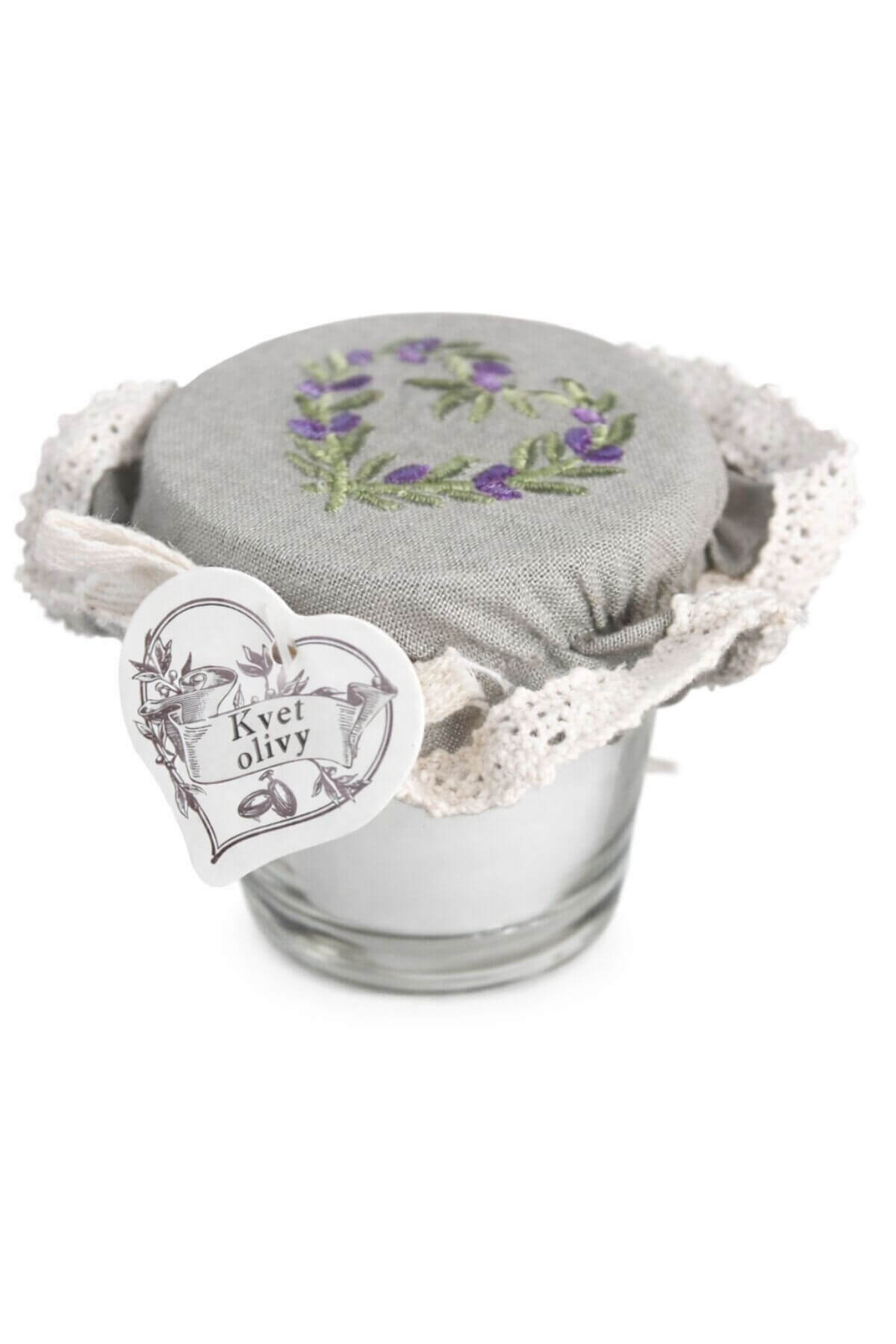 Olíva illatú gyertya egy üvegedényben. A gyertya műanyag fedővel rendelkezik, amely segít a gyertyát jó állapotban tartani. A gyertyák felső részét szövet borítja, amely hímzett levelekkel és olajbogyókkal van díszítve. A szélein csipke szalag található.