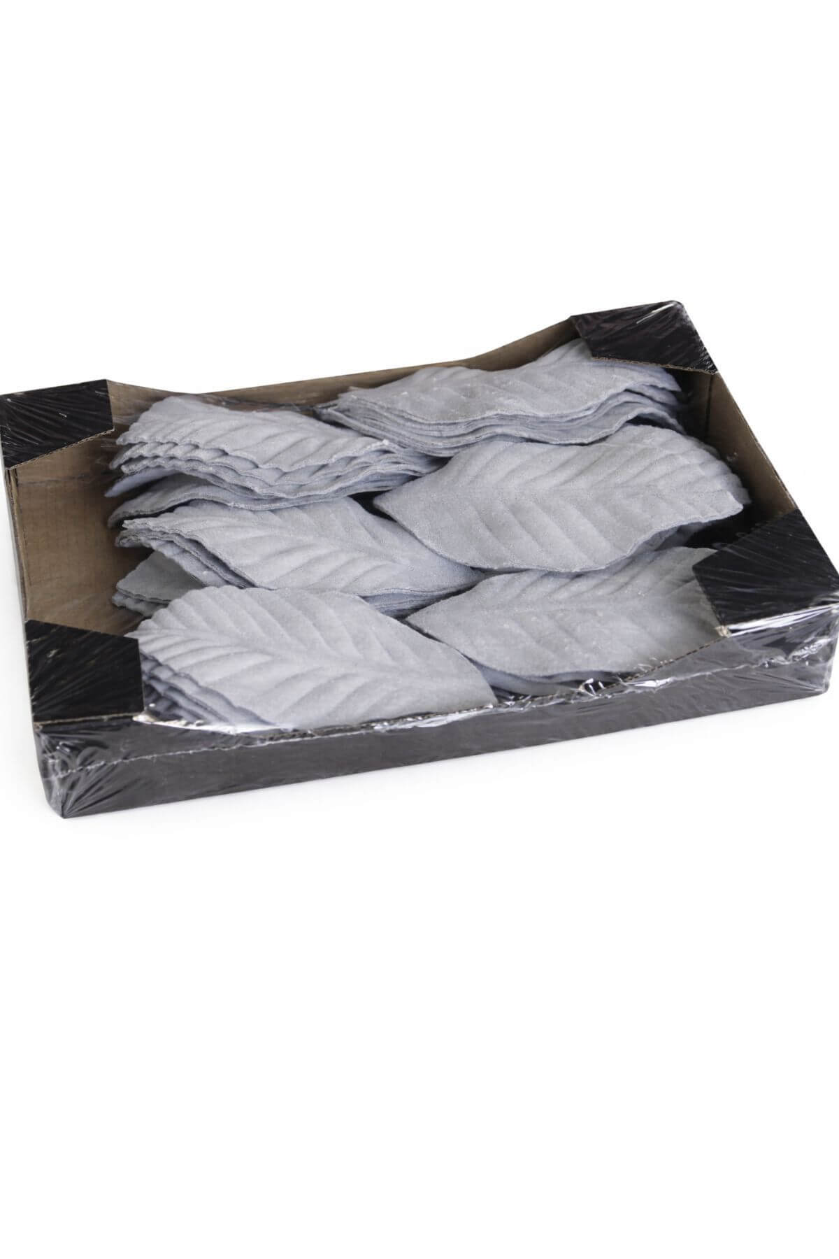 Szürke levelek, dróttal, egy díszdobozban. Ideálisak dekorálásra, ill. karácsonyfadíszként is. A csomag 30 darab levelet tartalmaz, 5 leveles kötegekben.