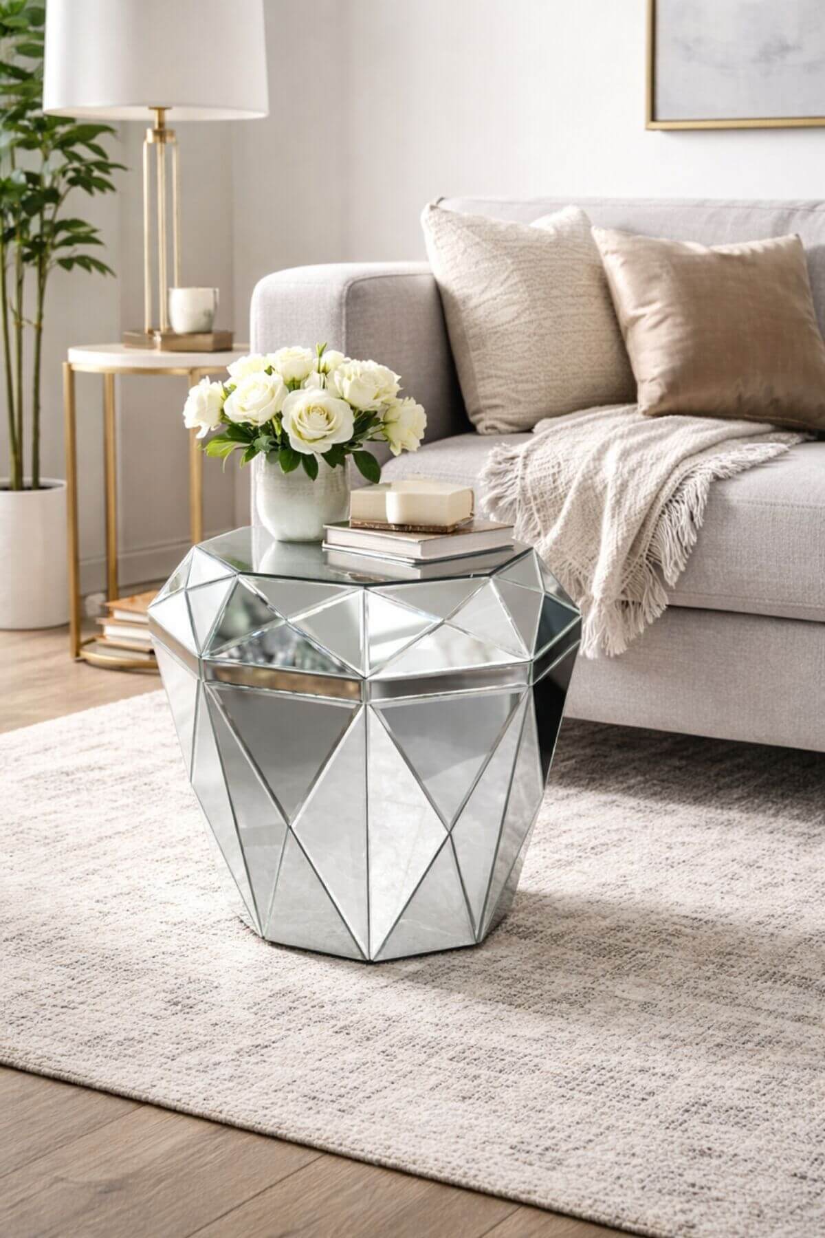 Ezüst színű, gyémánt dizájnú tükrös asztal - ideális dohányzóasztalként. Nemcsak praktikus, de elegáns kiegészítőként is szolgál. Az asztal exkluzív kialakítása miatt, azonnal felkelti az emberek figyelmét.