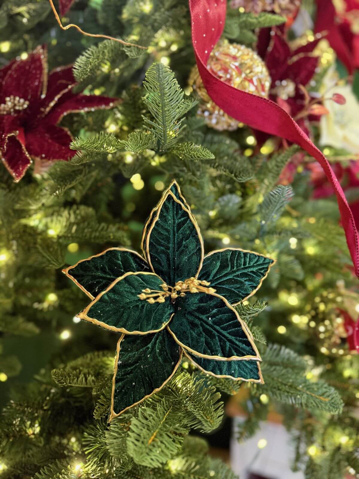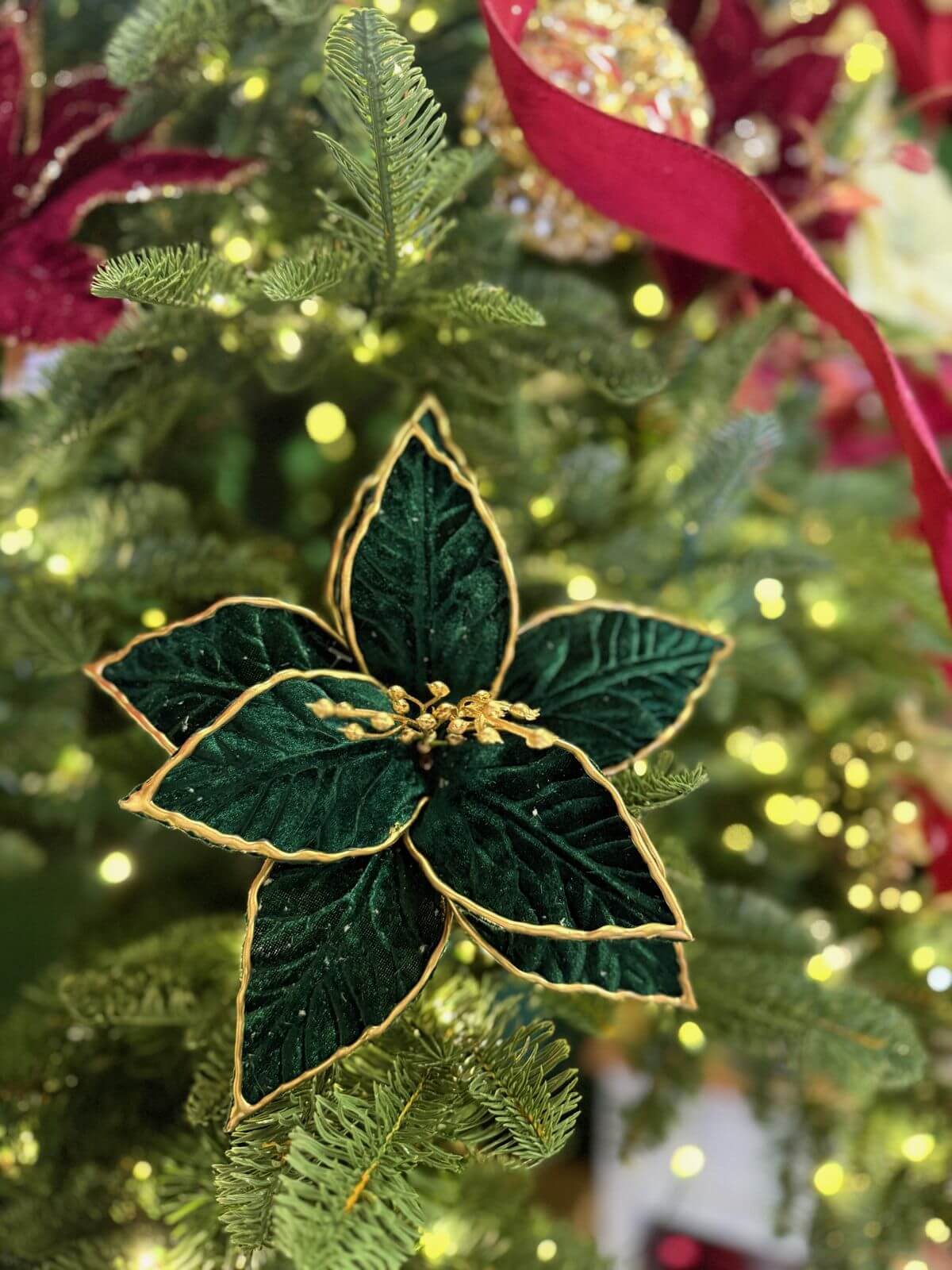 A zöld-arany mikulásvirág gyönyörű dísz, amely ünnepi hangulatot teremt, és elegáns megjelenést kölcsönöz a karácsonyfának. Alkalmas karácsonyi dekorációs elrendezésekbe és adventi koszorúkba is.